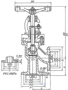性能參數(shù) 設計與制造符合中國國家標準 1、基本結(jié)構形式:角式 2、公稱壓力:PN1.6-4.0(MPa) 3、公稱通徑:DN15-300(mm) 應用規(guī)范 遵循規(guī)范 STANDARD 設計與制造 GB12233/GB 12235 結(jié)構長度 GB 12221/JB96(長系列) 結(jié)構長度 GB78/JB79(GB、HG、SH) 壓力試驗 GB/T 13927 標志 GB 12220 供貨 GB/T12252 1.6MPa主要連接尺寸 DN in L D D1 D2 f b z-φd Do H1 H2 W 15 1/2 65/90 95 65 45 2 14 4-φ14 100 240 265 7 20 3/4 75/95 105 75 55 2 16 4-φ14 100 245 270 7.5 25 1 80/100 115 85 65 2 16 4-φ14 120 250 275 8.5 32 21/4 95/105 135 100 78 2 18 4-φ18 140 260 290 12 40 21/2 100/115 145 110 85 2 18 4-φ18 140 290 325 14 50 2 115/125 160 125 100 2 20 4-φ18 160 300 335 19 65 21/2 145 180 145 120 2 20 4-φ18 180 355 400 27 80 3 155 195 160 135 2 22 4-φ18 240 400 450 42 100 4 175 215 180 155 2 24 8-φ18 240 455 495 50 125 5 200 245 210 185 2 26 8-φ18 280 530 560 64 150 6 240/225 280 240 210 2 28 8-φ23 320 605 650 85 200 8 275 335 295 265 2 30 8-φ23 360 650 770 155 2.5MPa主要連接尺寸 DN in L D D1 D2 f b z-φd Do H1 H2 W 15 1/2 65/90 95 65 45 2 16 4-φ14 120 245 270 7.5 20 3/4 75/95 105 75 55 2 16 4-φ14 120 250 275 8.8 25 1 80/100 115 85 65 2 16 4-φ14 140 260 290 11 32 21/4 95/105 135 100 78 2 18 4-φ18 140 290 325 13 40 21/2 100/115 145 110 85 3 18 4-φ18 160 300 335 18 50 2 115/125 160 125 100 3 20 4-φ18 180 355 400 31 65 21/2 145 180 145 120 3 22 8-φ18 220 400 450 39 80 3 155 195 160 135 3 22 8-φ18 280 450 495 50 100 4 175 230 190 160 3 24 8-φ23 320 530 590 60 125 5 200 270 220 188 3 28 8-φ25 380 600 650 75 150 6 240/225 300 250 218 3 30 8-φ25 400 650 770 98 200 8 275 360 310 278 3 34 12-φ23 450 700 850 170 產(chǎn)品尺寸